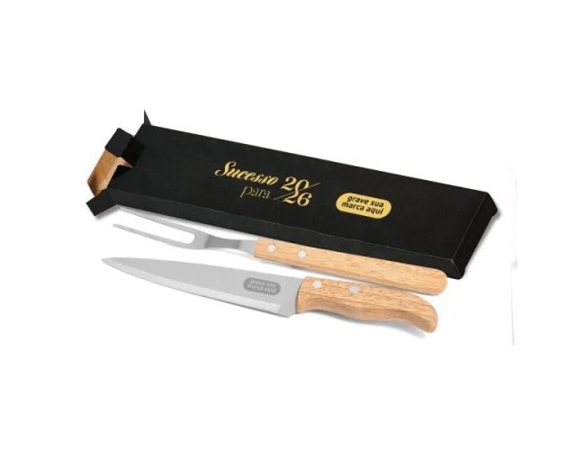 Conjunto de Faca em Madeira/Aço Inox; Acompanha faca 7'', garfo em Madeira/Inox e caixa para presente.