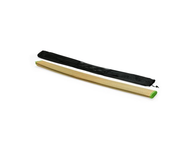 Descrição: Esteira leve em palha natural com bordas costuradas em nylon. Acompanha saco de nylon com seção telada, cordão de fechamento e alça regulável para transporte.