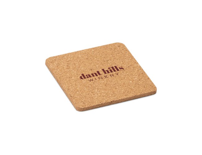 Porta-copos confeccionado em cortiça natural, com formato quadrado e cantos arredondados, ideal para proteger superfícies com praticidade e elegância.