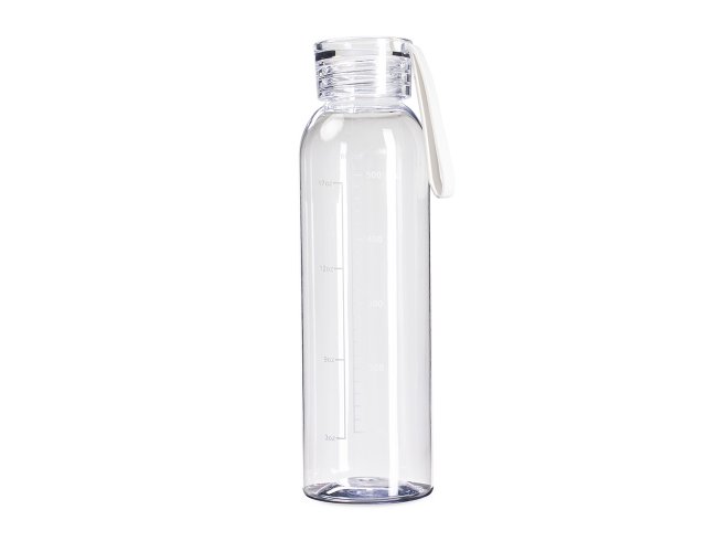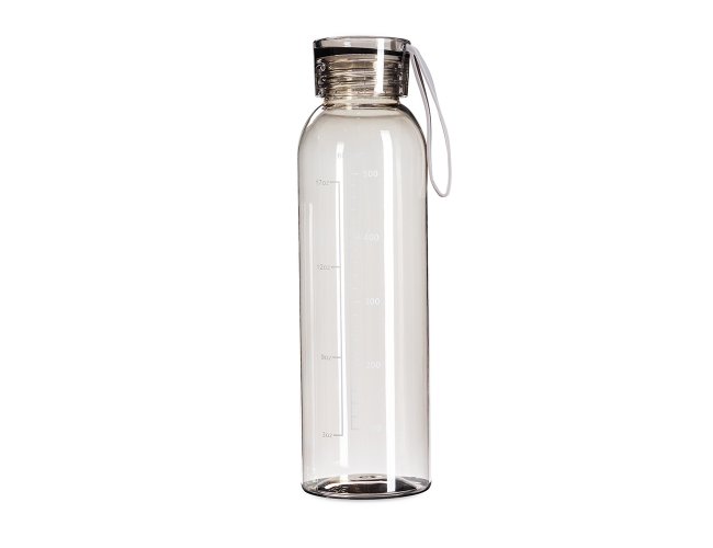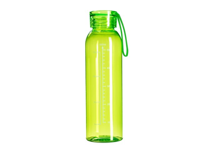 Garrafa feita em plástico livre de BPA com capacidade máxima de 640ml e marcação de volume impressa de até 600ml.