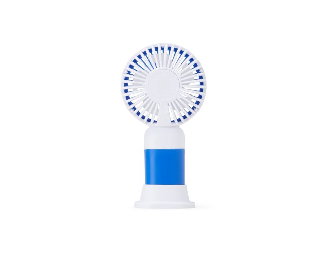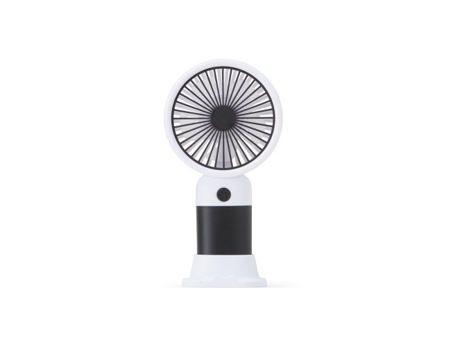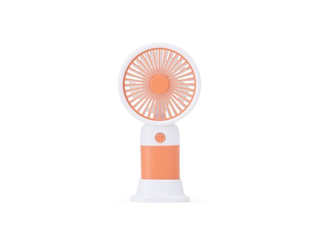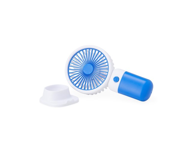 Descrição: Mini ventilador plástico recarregável com base removível e botão de acionamento. Acompanha cabo usb.