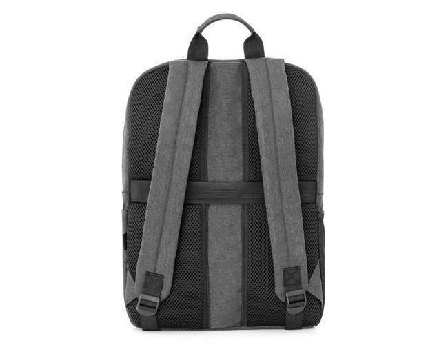 Mochila para notebook em rPET 600D com alças almofadadas. O compartimento principal tem 2 divisórias almofadadas para notebook até 15.6'' e tablet até 10.5''. Contém dois bolsos com fecho na parte frontal e um bolso lateral em rede com elástico. Parte posterior almofadada com banda para transporte em trolley. 300 x 420 x 110 mm
