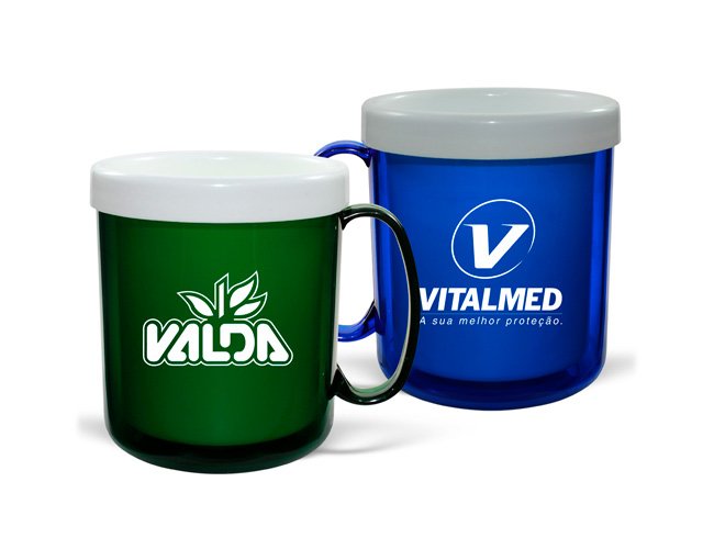 Caneca térmica com 300 ml de capacidade. Fabricada em PS. Livre de BPA. Cores cristal: azul, verde, vermelho e lilás.