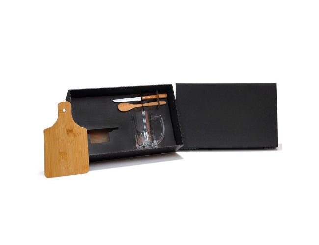 Kit churrasco três peças em estojo de papel kraft, contém: faca, garfo e tábua de corte com canaleta.